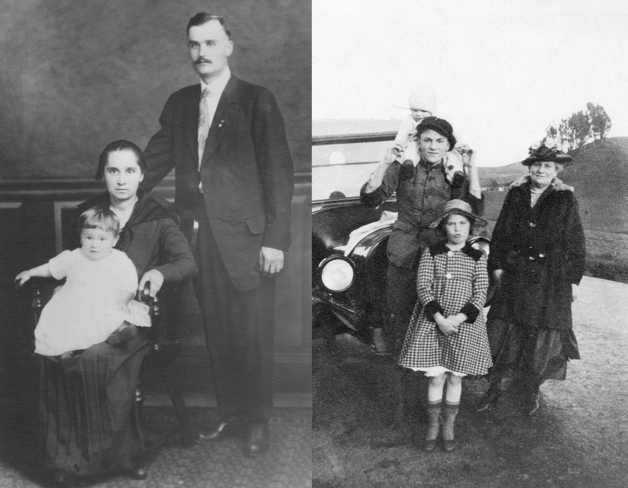 The two photos here were taken around the same time. The photo on the right shows my dad with his mom and a couple of cousins. It was taken in California on April 17, 1921—five days before my mom’s second birthday. My dad is 18 here.